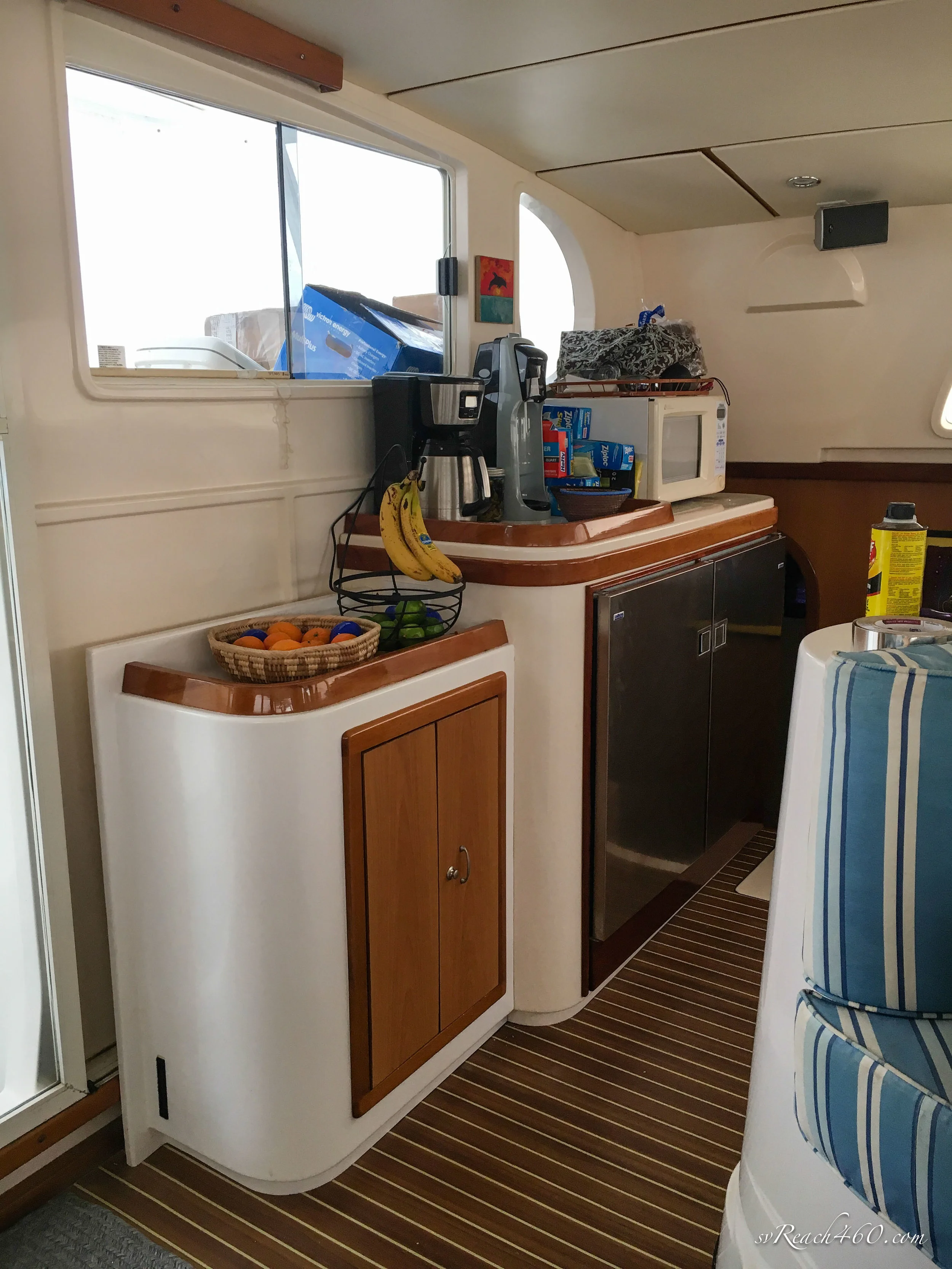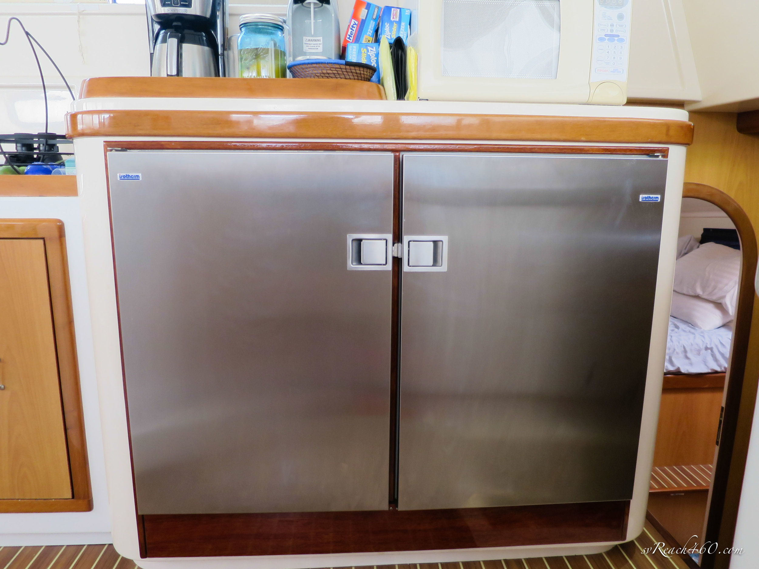The Isotherm refrigerator and freezer came with the boat newly installed. They are nice and spacious. The space is broken up differently, and I do find it is nice to have a front-opening door. However, they are definitely not as efficient with power consumption as our former, top-loading and heavily insulated fridge/freezer.