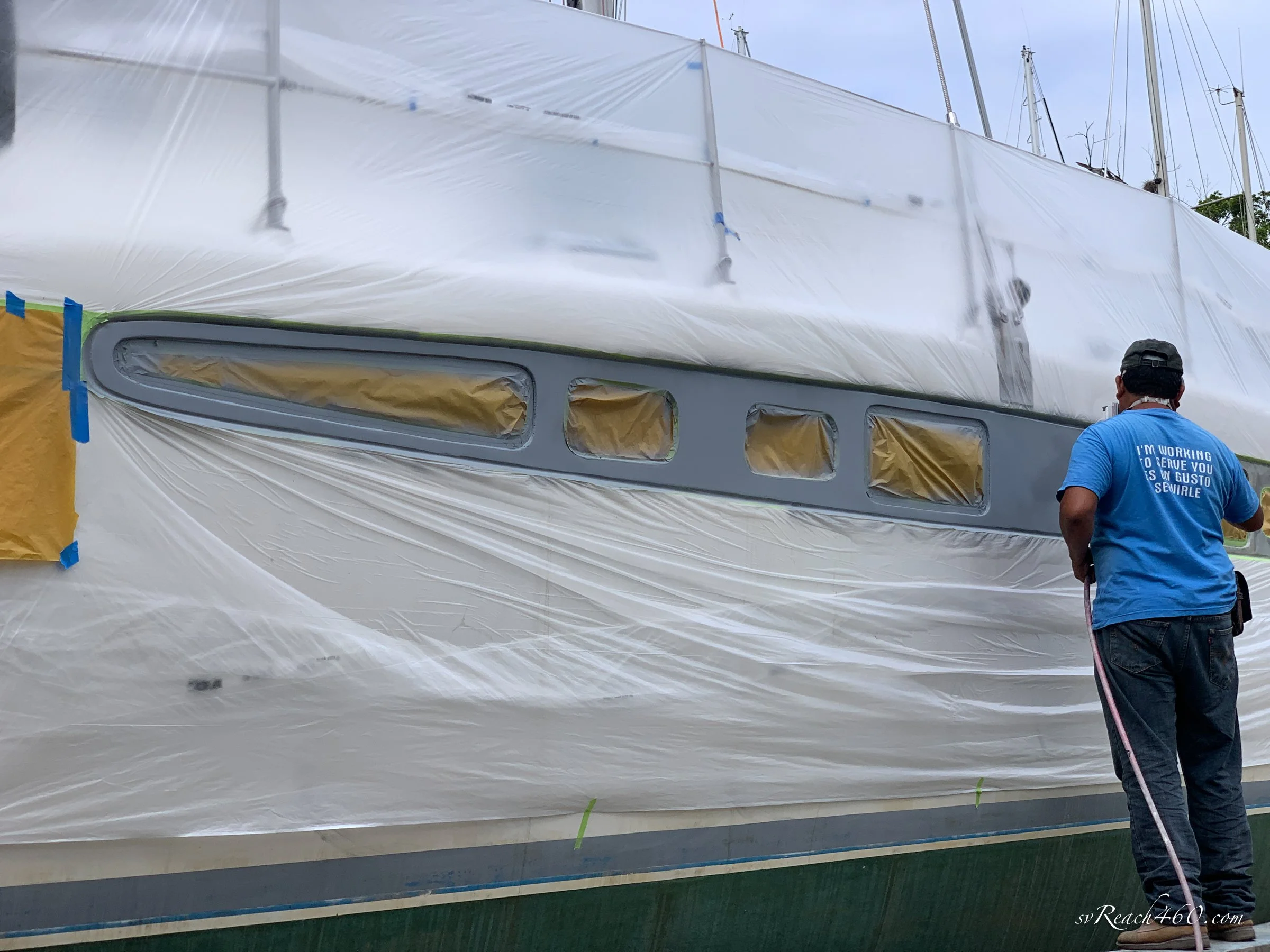 Reach was hauled out in RAM Marina in the Rio Dulce, Guatemala, starting in mid-Oct 2023. Replacing the black cutouts around the side windows and ports was one of several major fiberglass projects on the list (others include filling the chine and stern extensions). It was also the only one that Mark decided to farm out to the yard. It was a tough job.