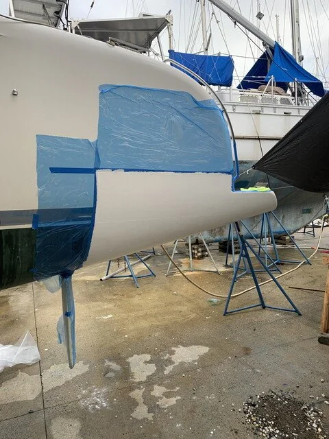 The mold was made from just aft of the rudder post. The hull above was masked off, the bottom waxed with mold release wax, and then PVA mold release was added on top. Our bottom antifoul was Coppercoat (at the time), which didn't require removing to make the mold. If it was antifouling paint (which is what it will be in the future), then that would need to be removed first.