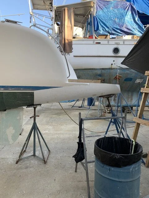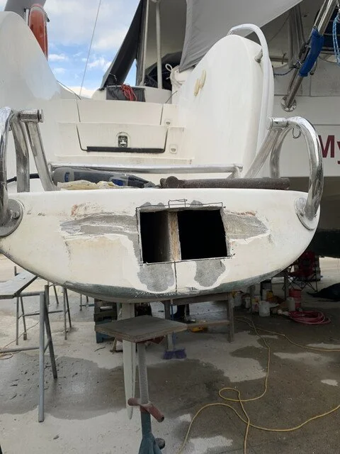 On our current haulout, we decided to make a Dolphin 475 by adding 20" to the sterns. The reason is to better balance the boat and to provide a bit more useful landing area. Dolphin really should have shortened the side cheeks a bit more than they did to make an easier dinghy landing area, but the main reason for the addition is that after adding 800w of solar over the davits, putting on a large RIB, and removing the genset from the bow, the sterns were really dragging.