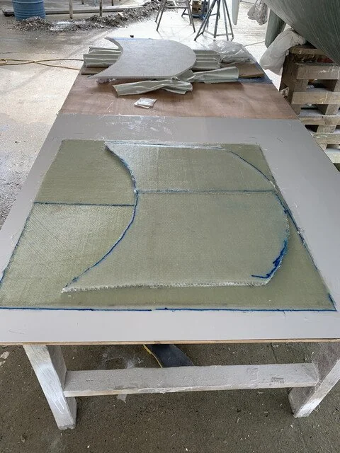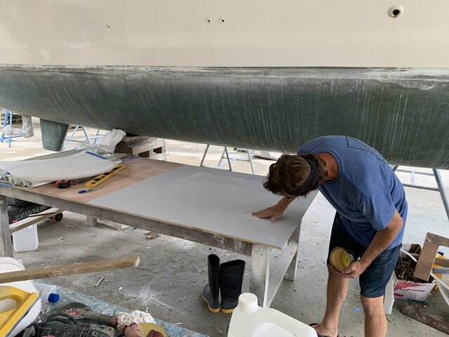 These are easy, as they are just flat tops extending from the existing ones. I made a layup table by gluing formica onto a piece of plywood. This is waxed and treated with PVA like the mold, then gelcoat is added, after which the same layup as the sterns - 3 layers of triaxial, a 12mm core, then another layer of triax on top.