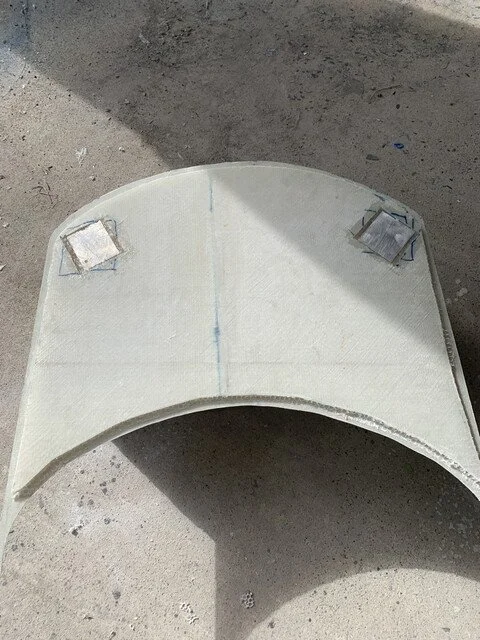 The layup schedule for the new sterns was decided at 3 layers of 1200g/m2 triaxial stitched fabric followed by a 12mm polypropylene honeycomb core, with another layer of the same triax glass on top of that. This gives a 5mm bottom skin and an overall thickness of ~19mm. No calculations were done to decide on this - it just seemed "right".