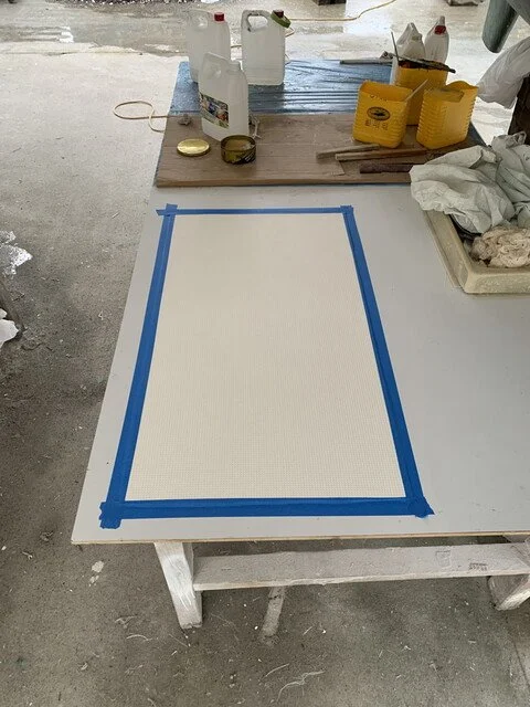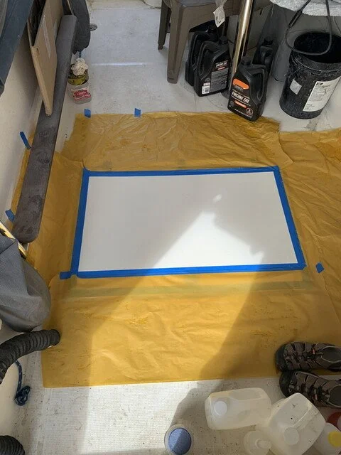 Time to make new nonskid for them. For this, I used the cockpit locker lid to make a mold because it is the largest piece of continuous nonskid on the boat. Just like in making the stern mold, it is waxed and PVA'd, gelcoat is added, then two layers of CSM glass. Pull it off and you have a mold for making new nonskid.